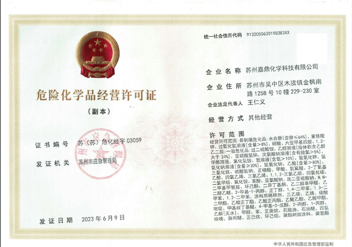 蘇州嘉鼎化學科技有限公司是一家專業高效、產品齊全的大型危險化學品供應鏈專業解決方案提供商,系蘇州化工行業協會理事單位,至今已有近十余年歷史。公司自有正規危險品倉庫、危險品車隊、化驗室、并能提供第三方檢測機構報告,可為終端使用工廠或貿易商提供有特殊要求化學品如中性標簽、全新各類規格包裝、混兌、阻燃、無味、安全、環保、定點危險品車配送等大部分公司不可滿足之服務。貴司只管接單,余下事務交由我們做。我司擁有華東地區多家大型終端工廠和一線品牌代理商配套合作服務經驗,系華東地區化學品經營規模化公司之一。誠信、專業、高效是我們的經營理念,合作共贏是我們的終極目標。 我們產品涵蓋有機溶劑、無機酸堿鹽、實...